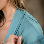 Our patent-pending bustle sleeves were designed with real life in mind. They give you the drama of a flowing kimono sleeve when you want it—and the practicality of a buttoned-up sleeve when you don’t. Each sleeve features a discreet loop and shoulder button, so you can bustle them up while cooking, cleaning, getting ready, or wrangling kids without getting them wet or in the way.